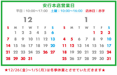 12月26日(金)〜1月5日(月)まで、冬季休業とさせていただきます。